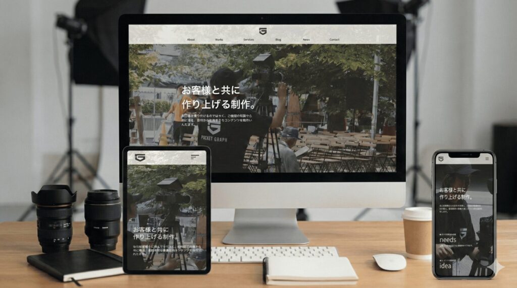 動画制作だけでなくグラフィックデザインなどもされる「Pocket Graph」さま。ご依頼前は、ご自身でWixで制作されていました。(弊社から見てもスッキリとした良いホームページでした)ただ、今後ビジネスを拡充していく上で、ターゲットとしているキーワード「川越 動画制作」で検索上位に表示されない、Wixで作ったけど、もっと細部まで拘って作りたいという思いが強く、弊社にリニューアルのご相談をいただきました。