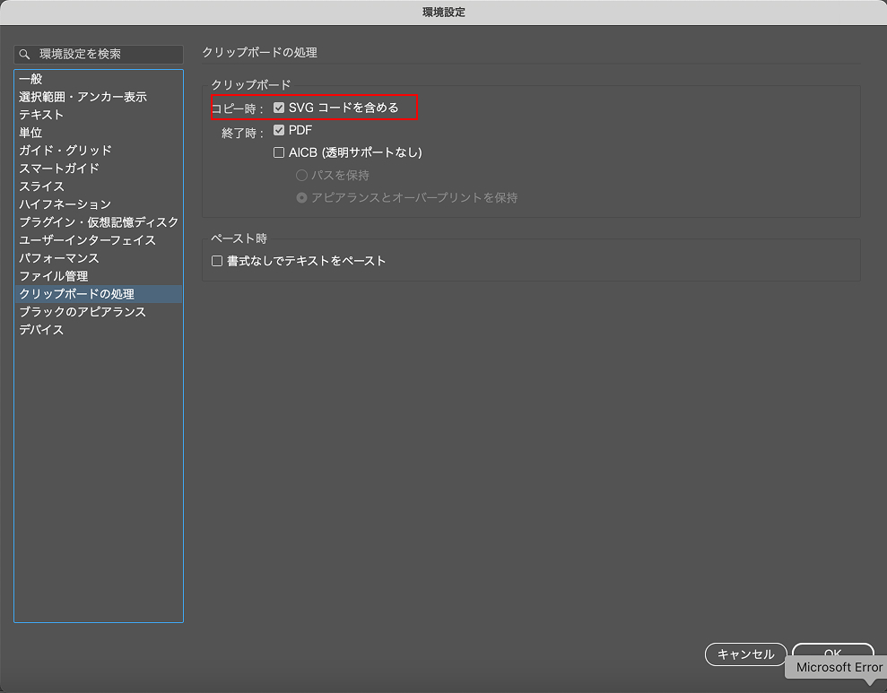 イラレからコピペしてもベクターデータとしてではなくラスターデータとして貼り付けられてしまう場合は、イラレの「設定」→「クリップボードの処理」で「コピー時:SVGコードを含める」にチェックが入っているかをご確認ください。ここにチェックが入っていないとベクターデータは貼り付けられません。(2025/10/23追記)